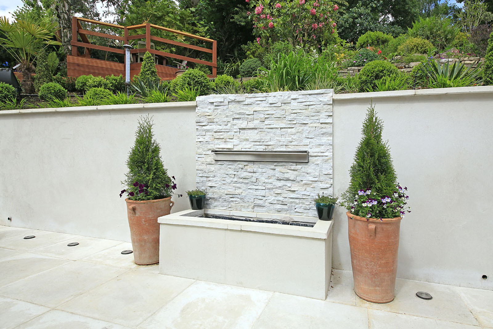 The ground was levelled and paved with designer white paving slabs, giving the garden a clean, contemporary feel. A water feature was installed as a focal point, adding movement and a sense of calm to the space.